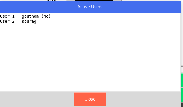 Uses tkinter module for the UI. First asks the user to login/register. After this, a chat window is opened. User can send messages from here. There is an option to view currently active users.